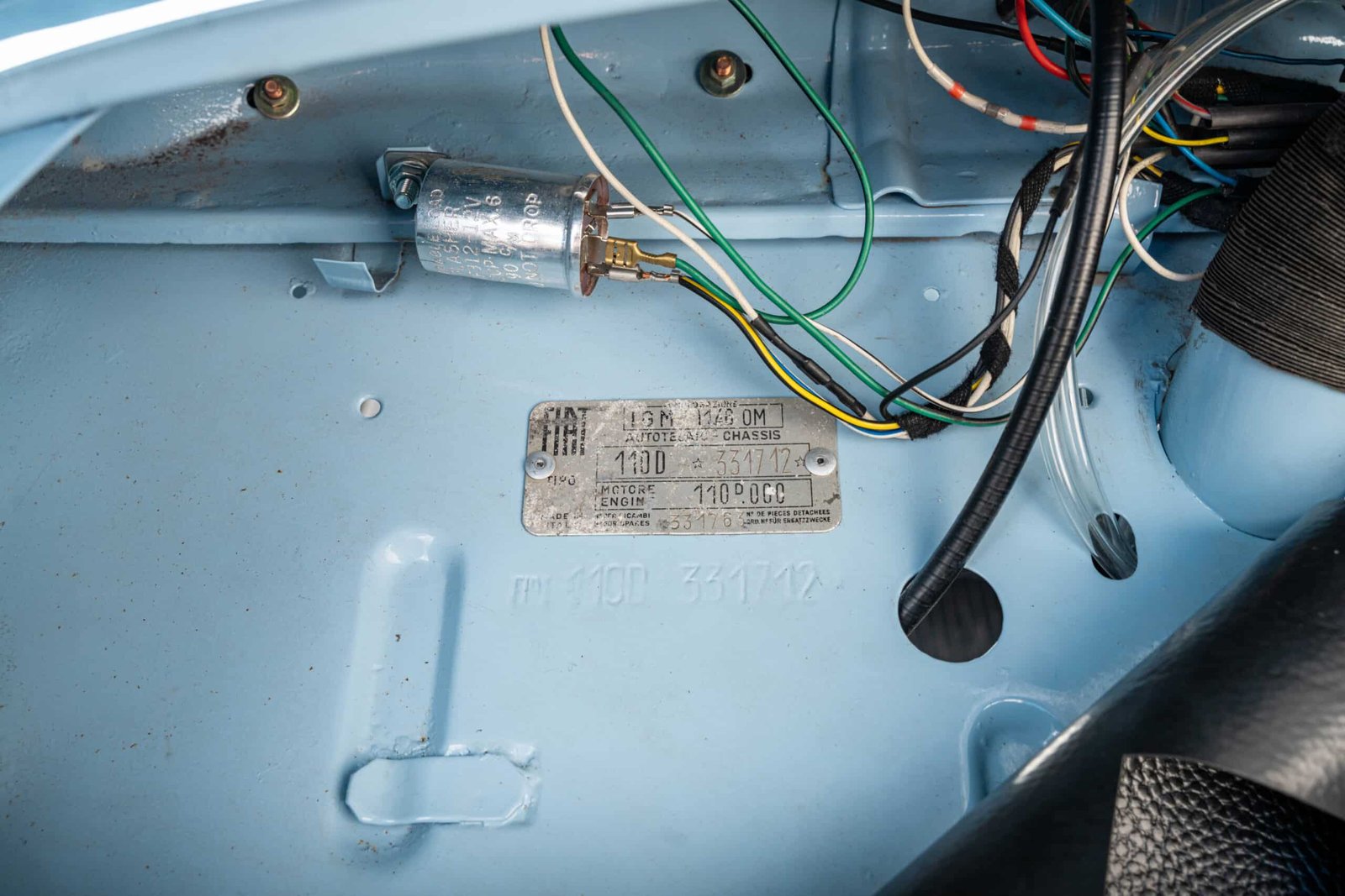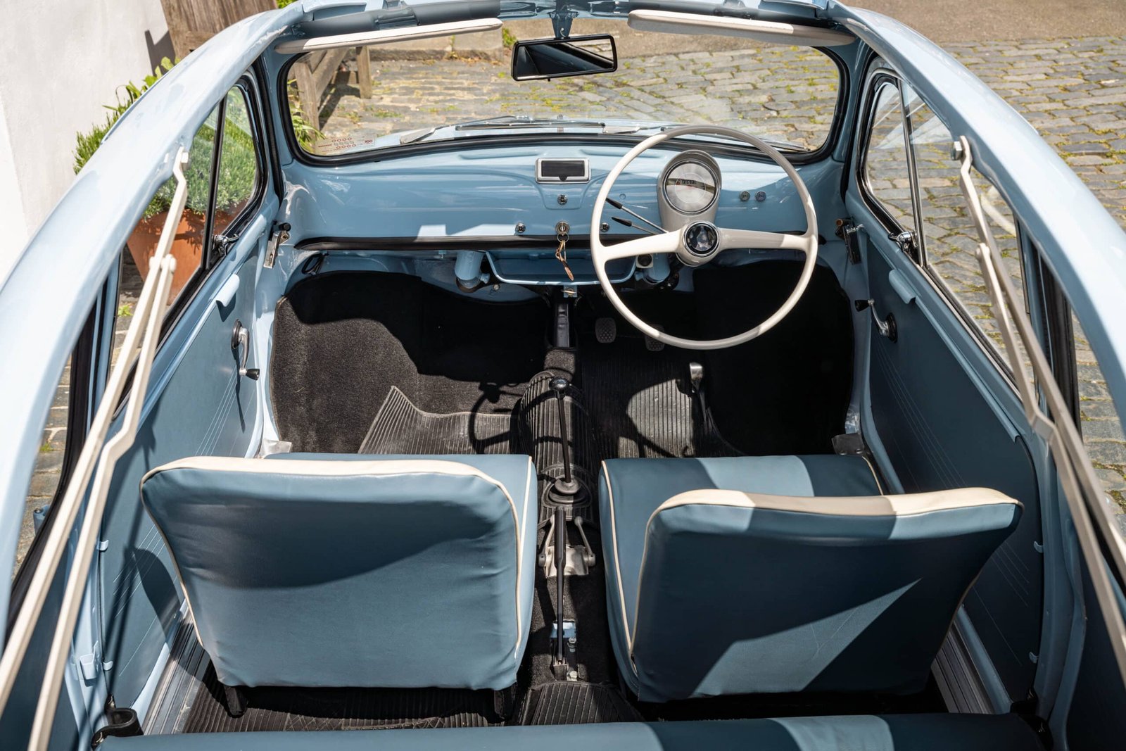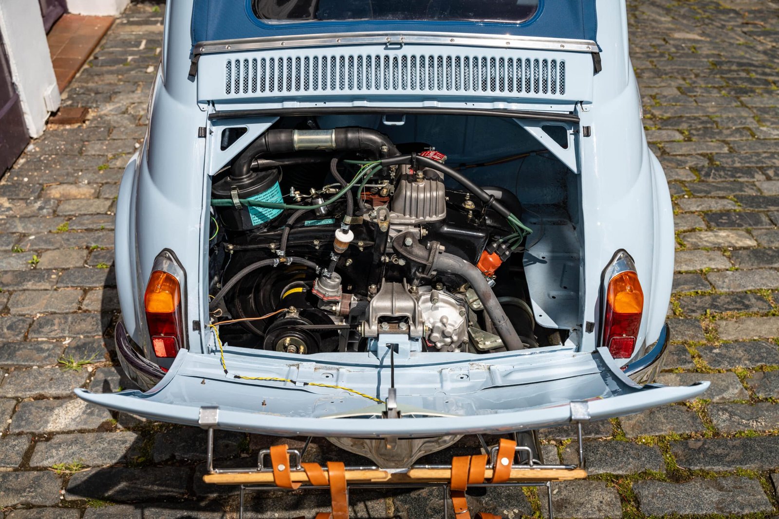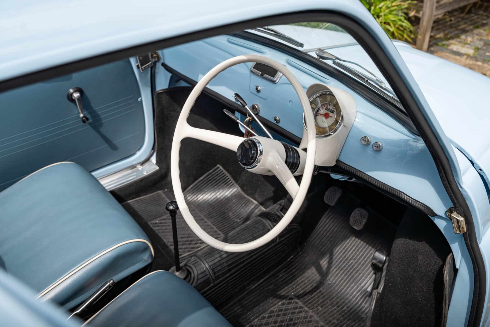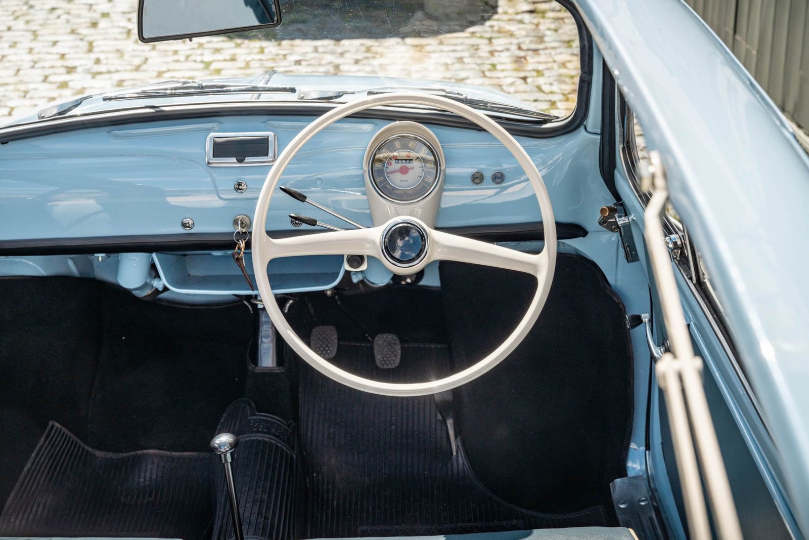 She now presents in her original Celeste Medio Blue paint (403) colour with blue transformable hood and matching blue vinyl interior trim. Her original and matching numbers engine does come with the car although she now has a hand-built Fiat 126 650cc engine producing over 28 hp which is paired to a matching and fully rebuilt 126 synchro transmission, both of which were built in Germany.