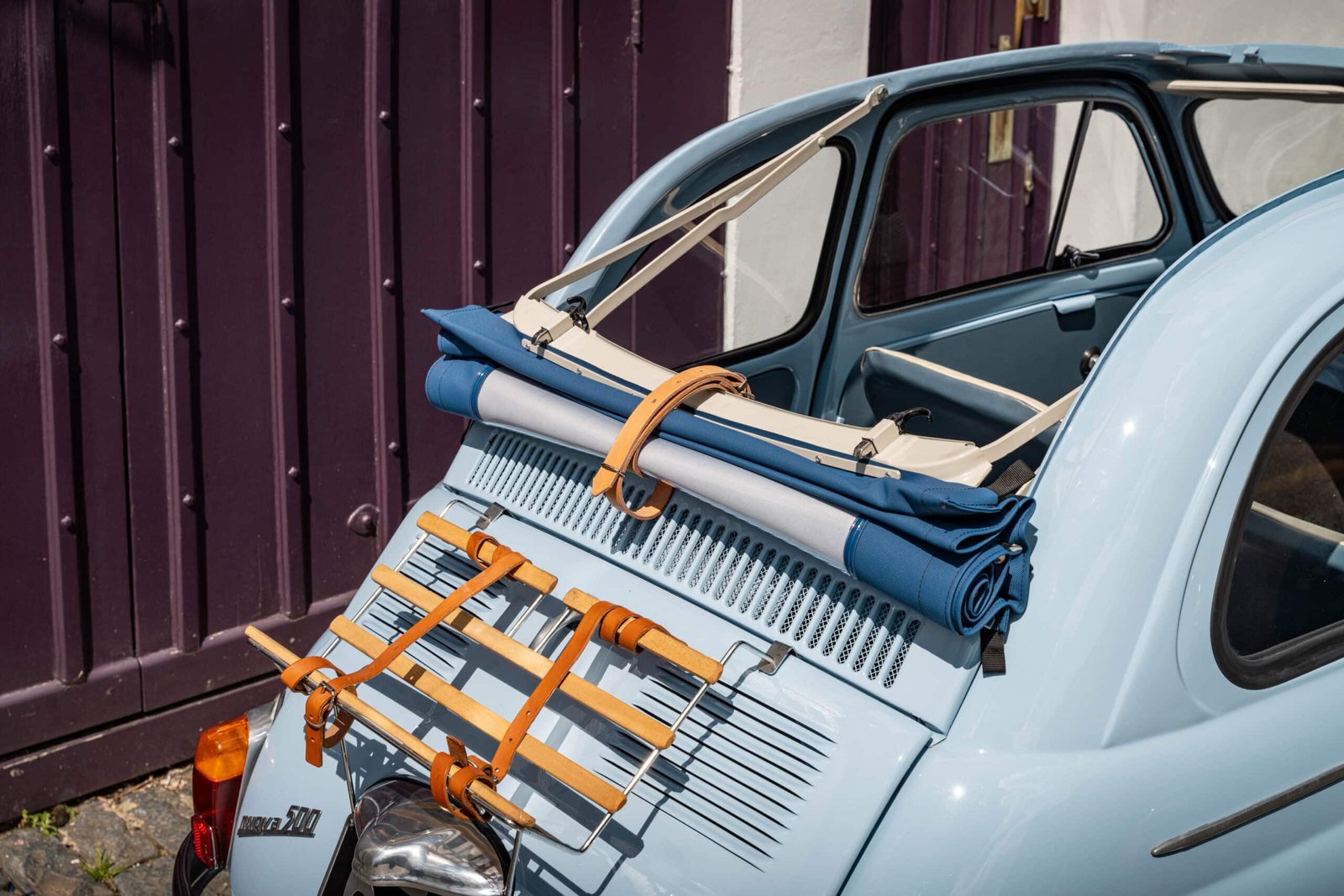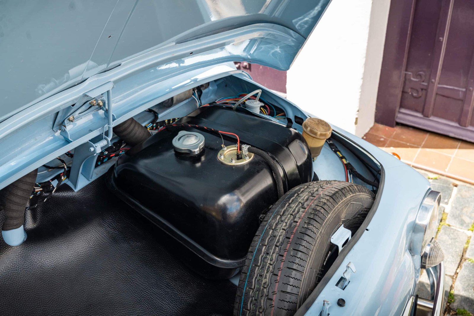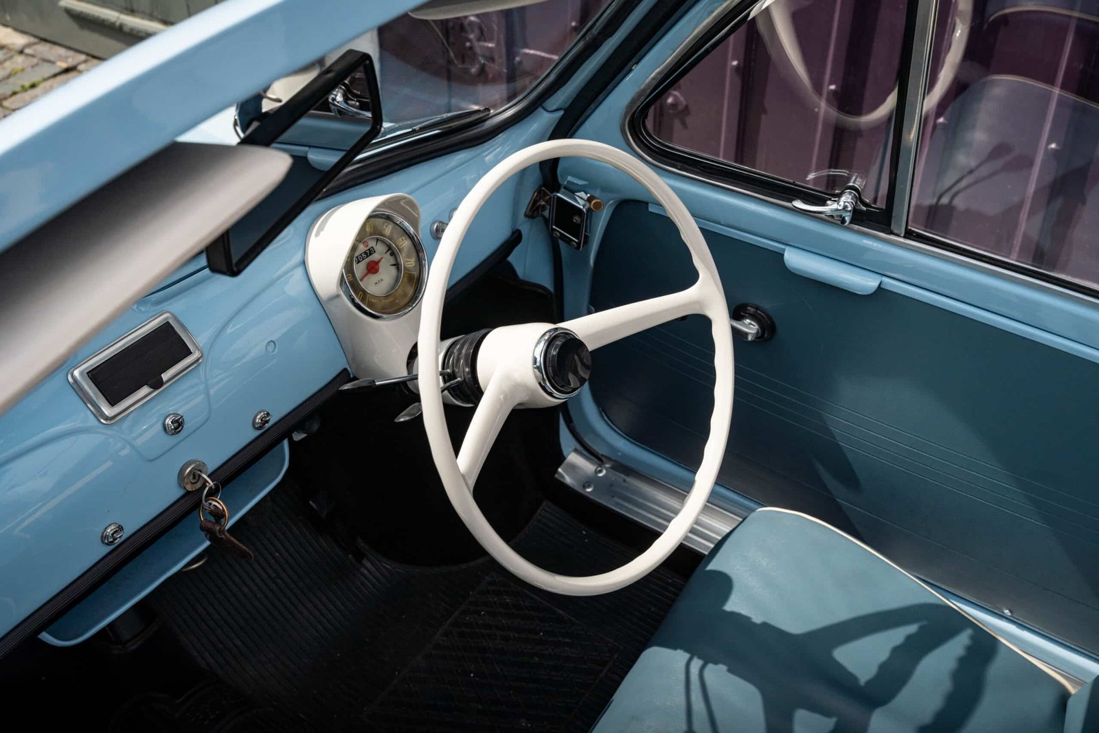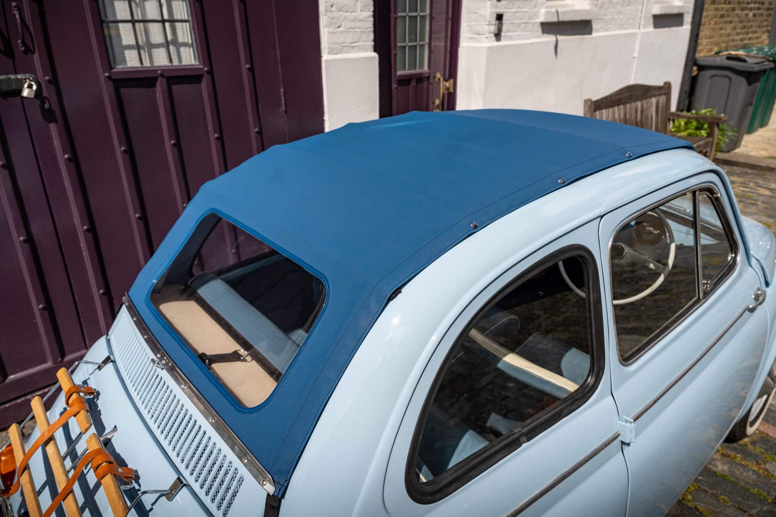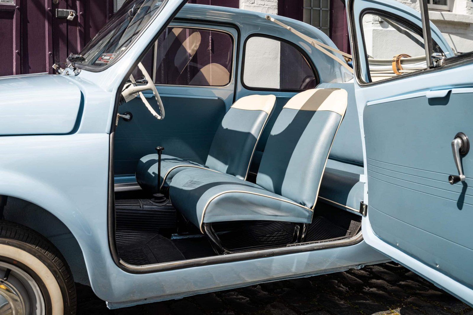She now presents in her original Celeste Medio Blue paint (403) colour with blue transformable hood and matching blue vinyl interior trim. Her original and matching numbers engine does come with the car although she now has a hand-built Fiat 126 650cc engine producing over 28 hp which is paired to a matching and fully rebuilt 126 synchro transmission, both of which were built in Germany.