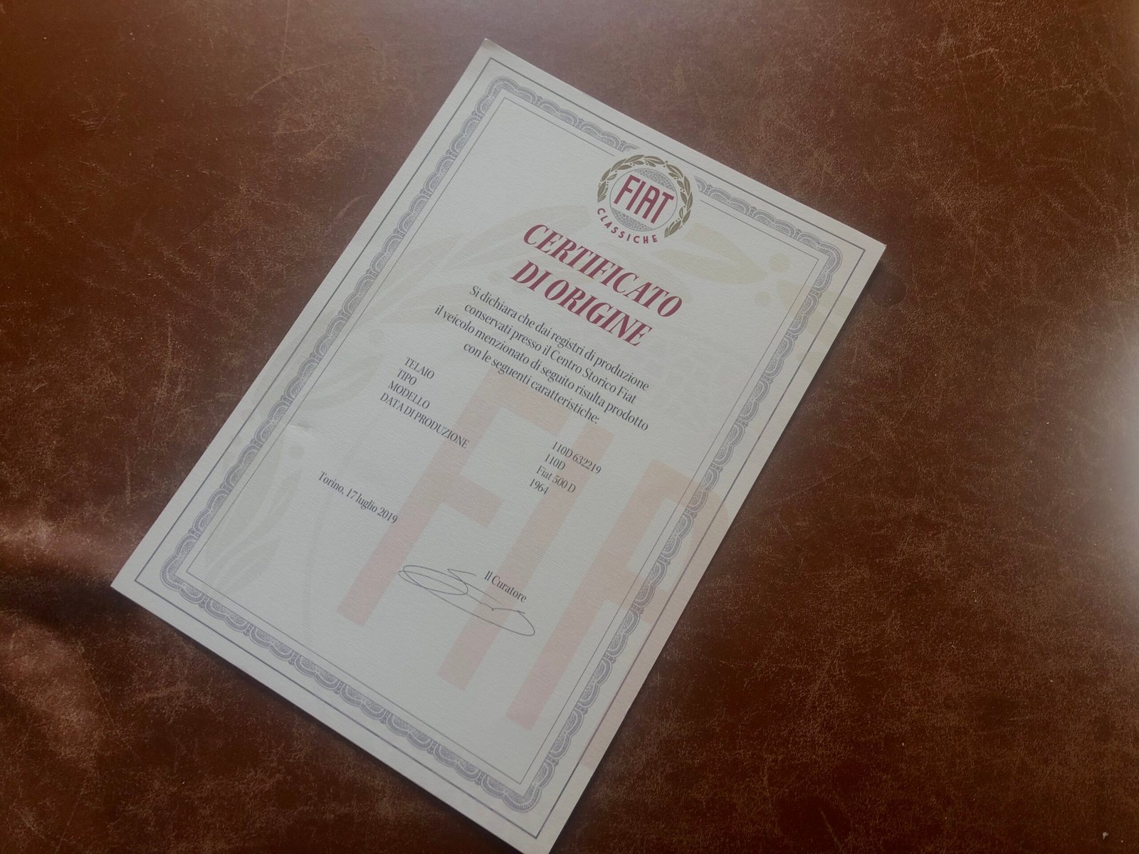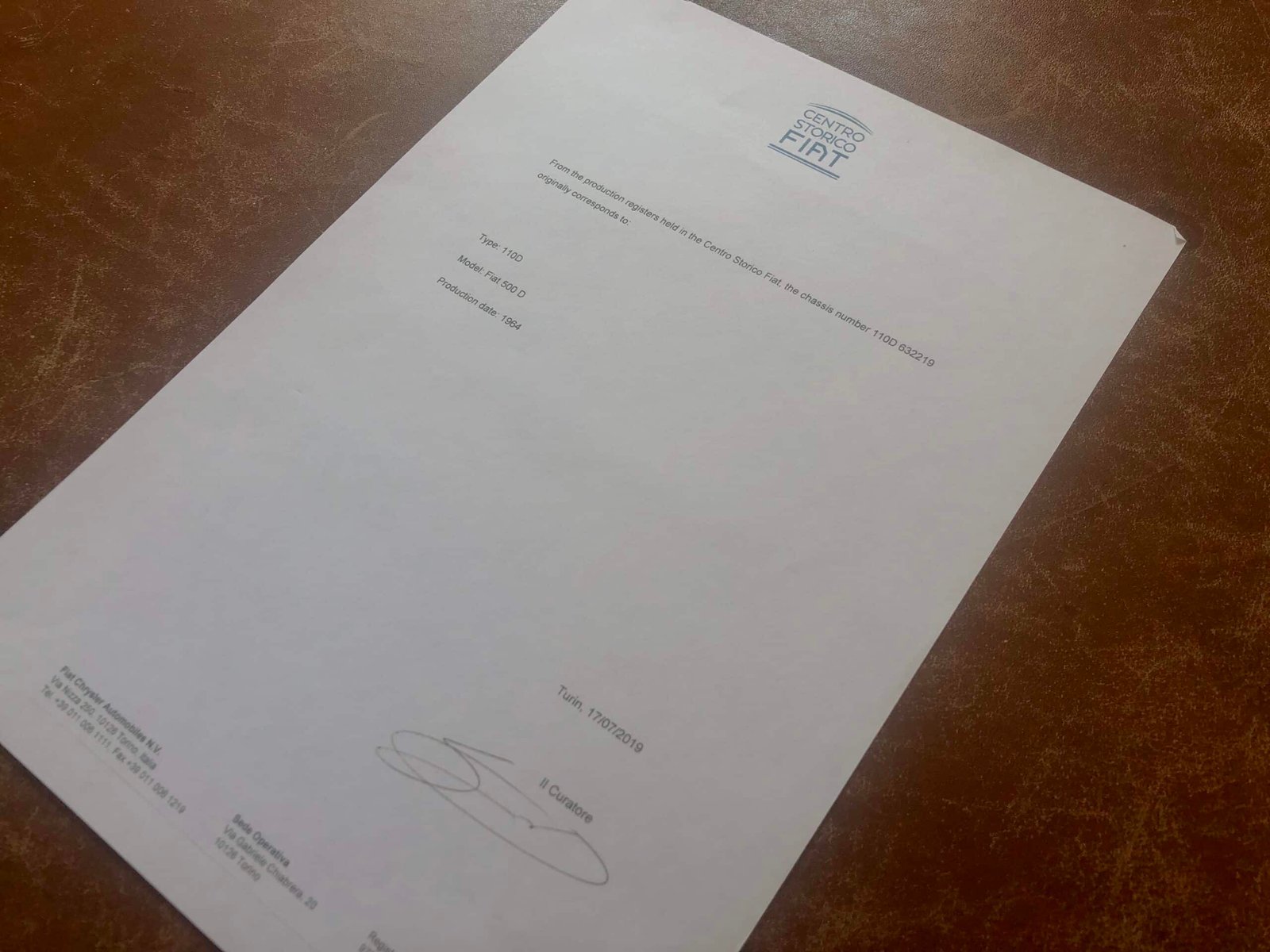 The sale includes a certificate of origin from FCA Fiat Chrysler Automobiles N. V that substantiates its correct chassis number, age and specification.