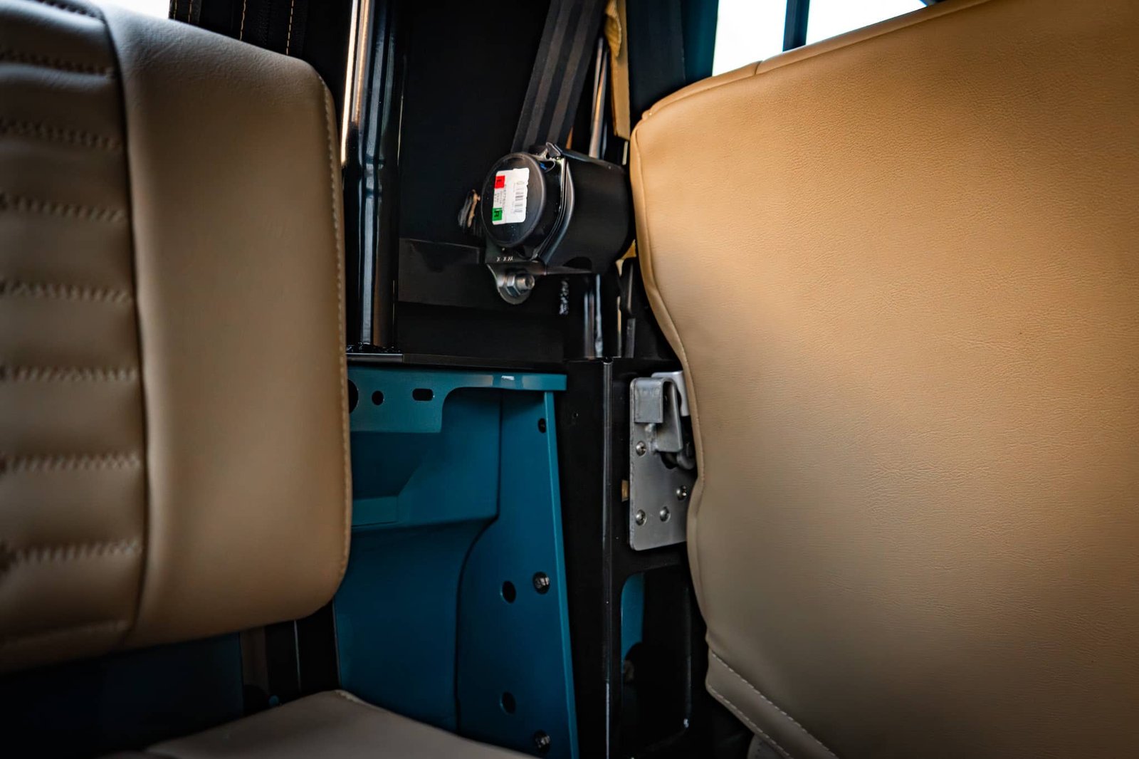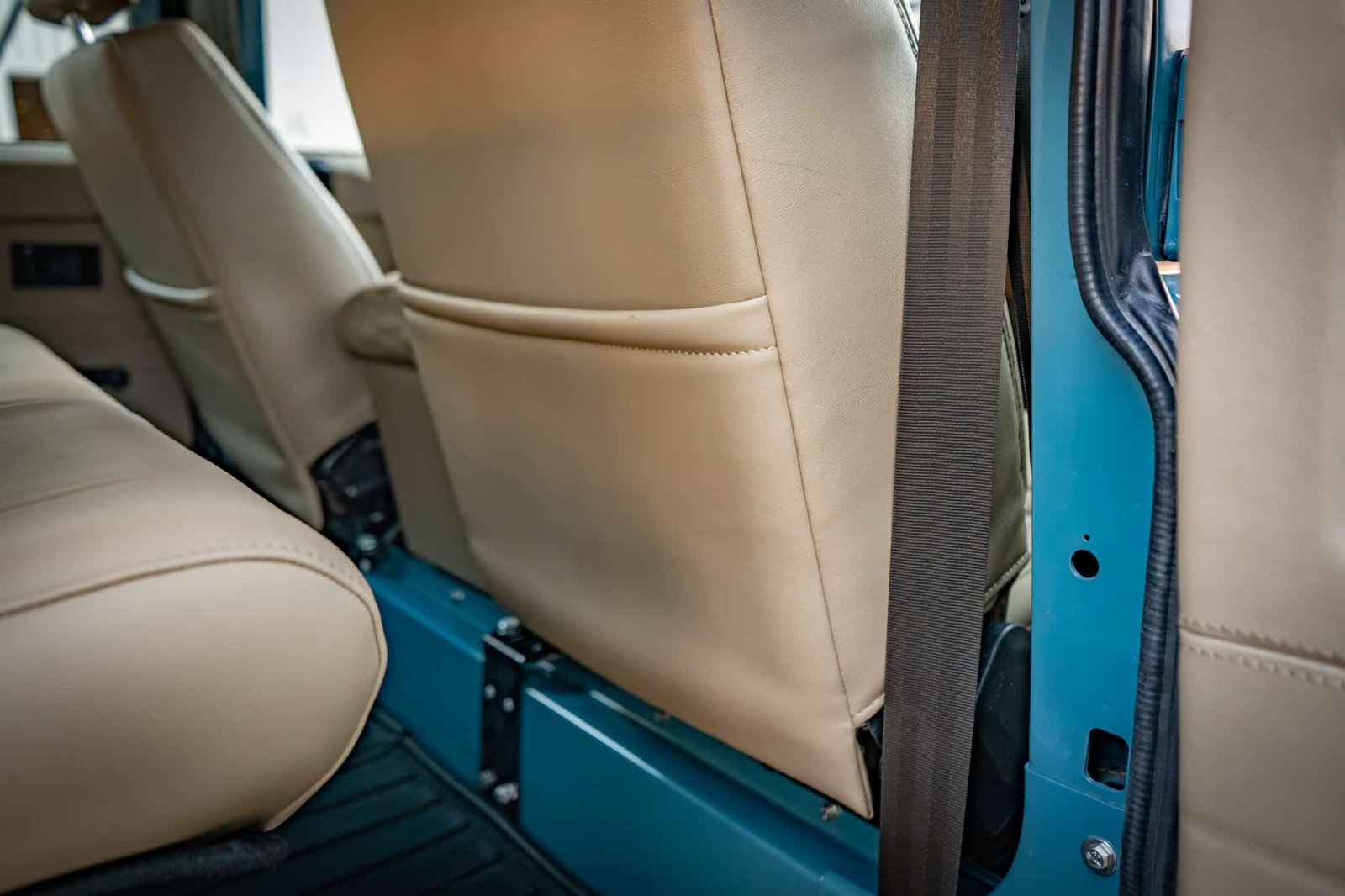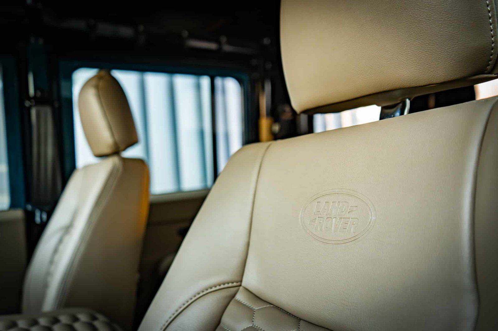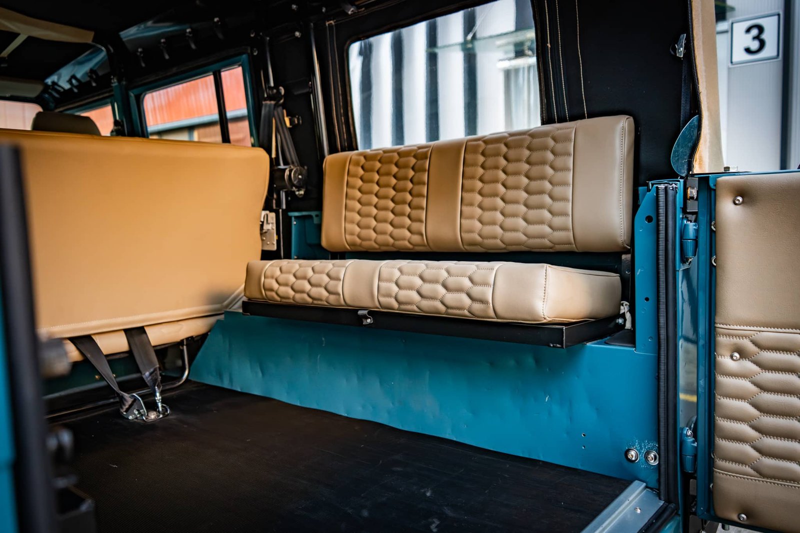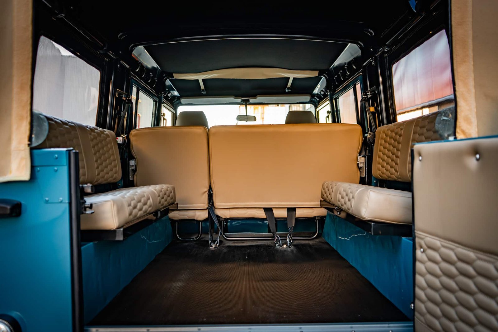 ● Seating for 9: 2 front seats (Land Rover-embossed), 3-seat middle bench, and inward-facing rear benches for 4