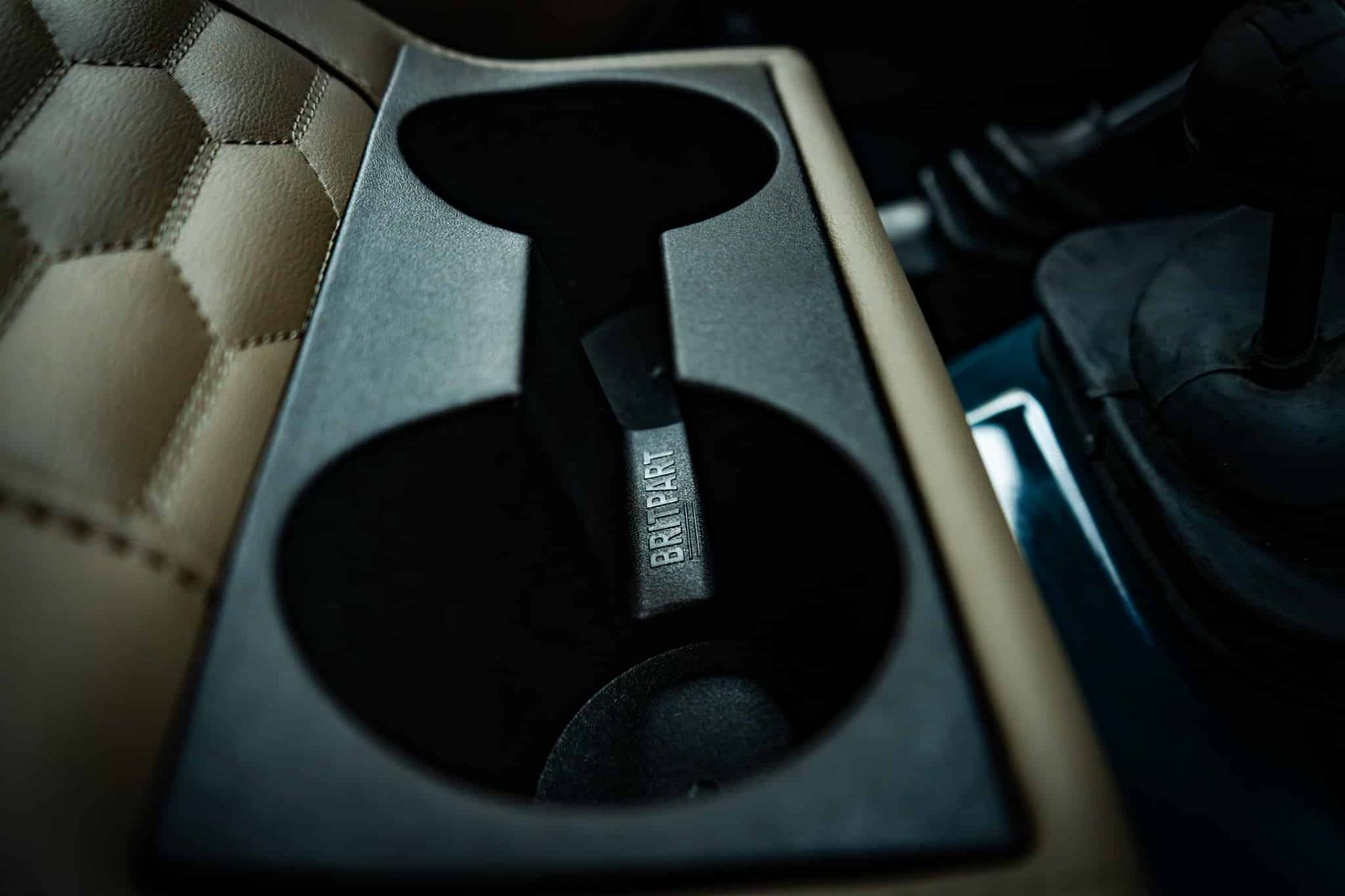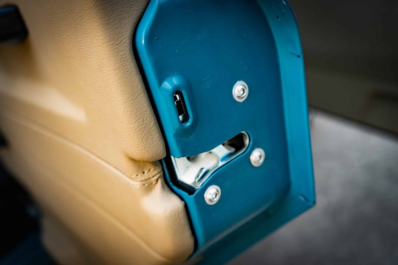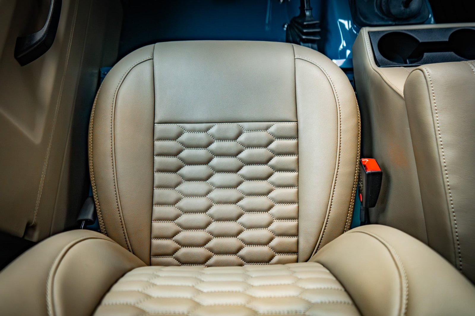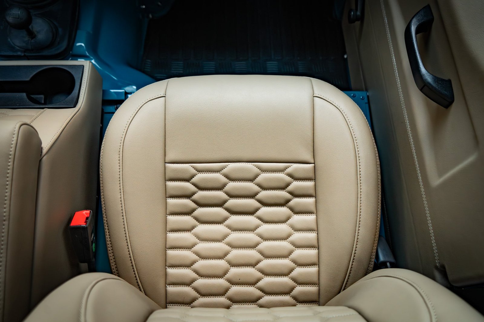 ● Beige synthetic leather upholstery with hexagon stitching